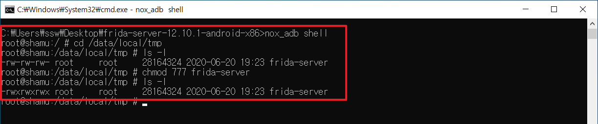 Step 4. 이제 서버를 실행해볼건데 frida-server의 권한은 666(-rw-rw-rw-)입니다. chmod 명령어를 이용하여 실행권한을 부여합니다. 저는 그냥 777로 했습니다.