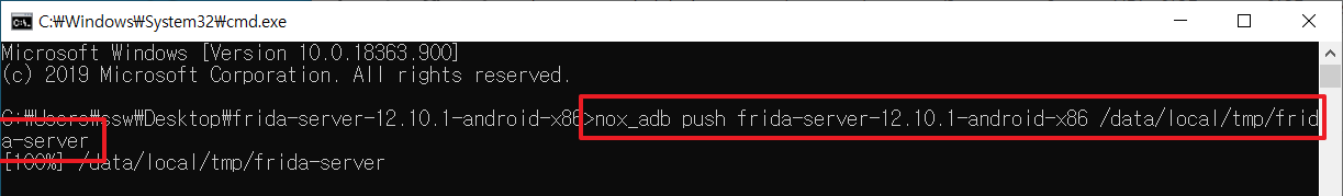 Step 3. 실행된 프롬프트 창에서 nox_adb push frida-server-12.10.1-android-x86 /data/local/tmp/frida-server 명령어를 이용하여 frida-server-12.10.1-android-x86를 Nox의 /data/local/tmp 경로에 frida-server 라는 이름으로 밀어넣어 줍니다.