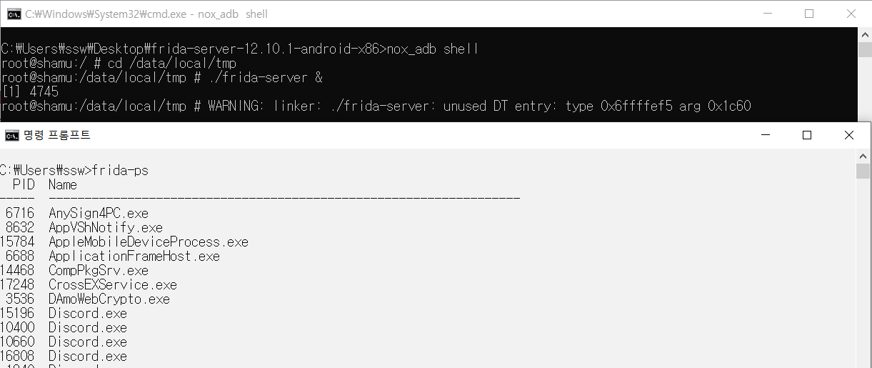 Step 5. ./frida-server & 명령어로 실행! 명령 프롬프트에서 frida-ps 명령어를 실행해봅니다.