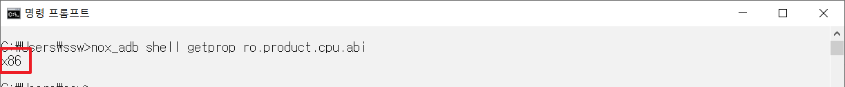 Step 2. nox_adb shell getprop ro.product.cpu.abi 라는 명령어로 Nox의 아키텍처가 어떻게 구성되었는지 확인합니다.