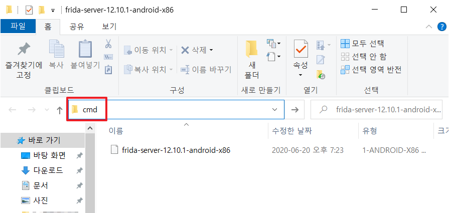 이제 압축 해제된 그 폴더에서 탐색기 주소창에 cmd 라고 입력합니다.(다른 방법도 많은데 저는 이게 편합니다.)