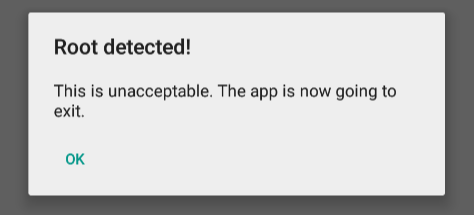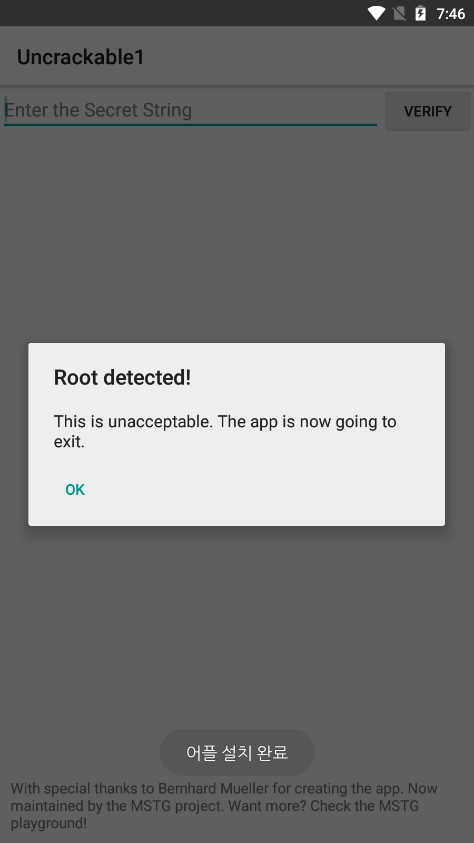 설치하면 바로 앱이 실행되면서 루팅이 탐지되었다라는 알림창이 나타납니다.