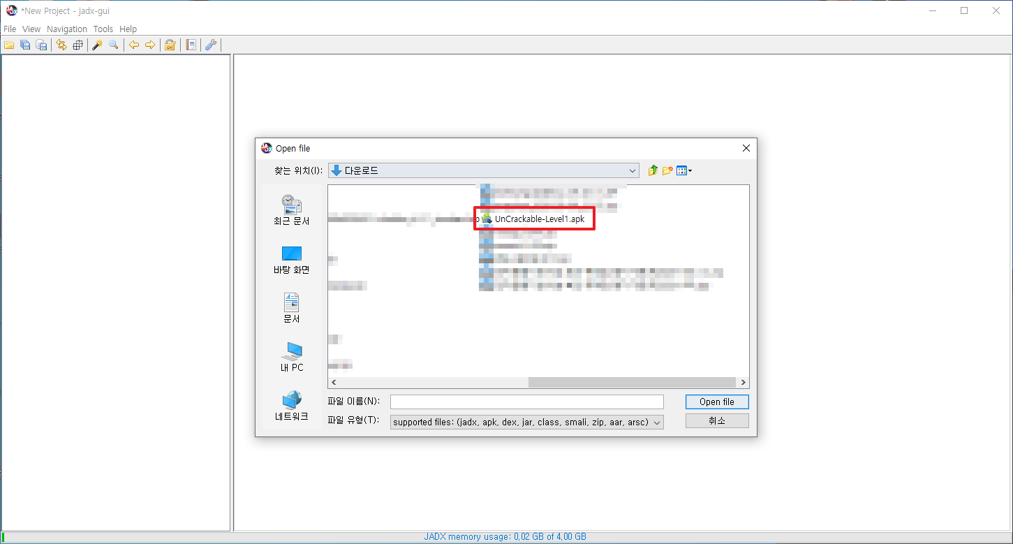 실행하고 대상 apk 파일인 Uncrackable-Level1.apk 파일을 선택하고 Open file!