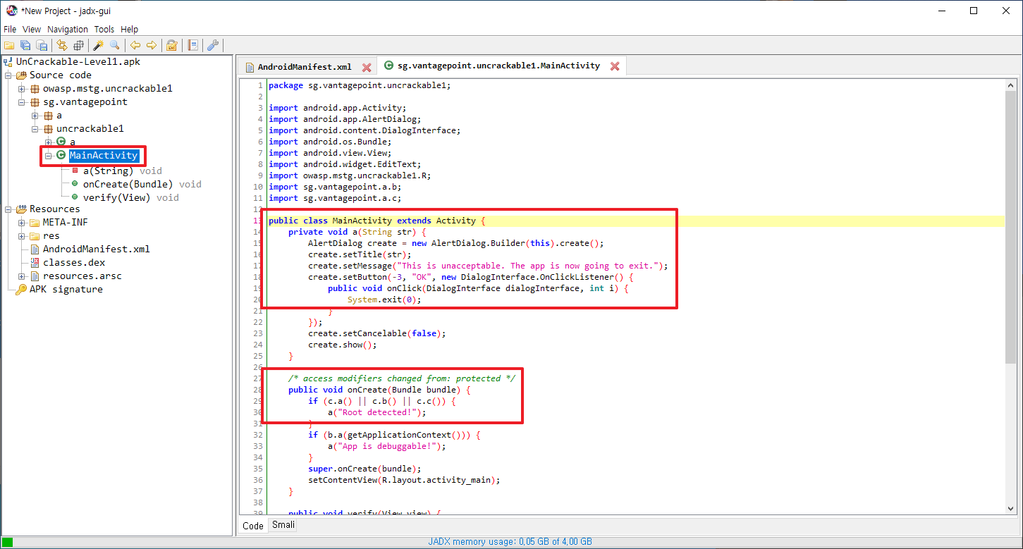 아까 교실 이름은 sg.vantagepoint.uncrackable1 이었구요