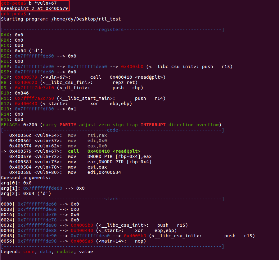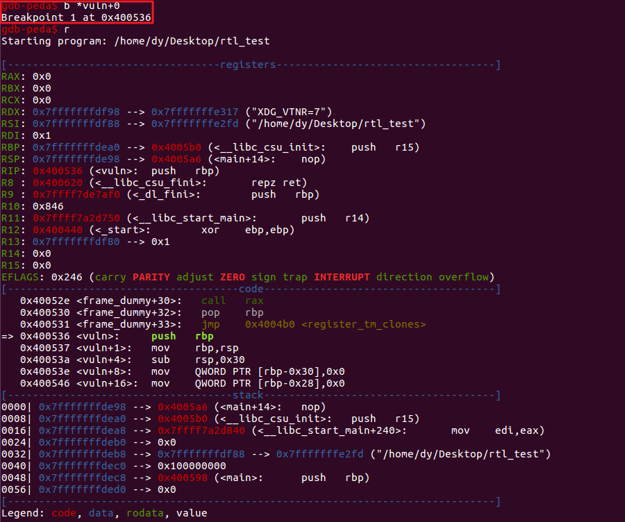 자!!!!!!!!!!!!!! 본격적으로 RTL을 시작해봅시다! vuln 함수 실행전인 *vuln+0 위치에 브레이크 포인트를 걸어줍니다.
