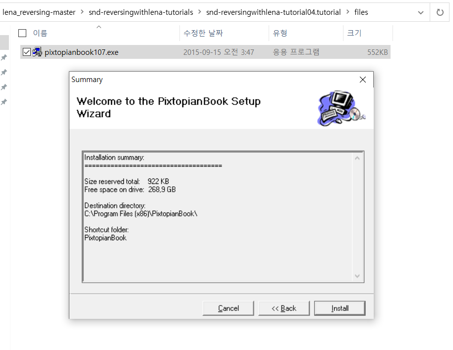 자... 레나튜토리얼4 파일로 오면 pixtopianbook107.exe 라는 응용프로그램이 있다.. 설치 프로그램인데 한번 설치를 해보자!!!!