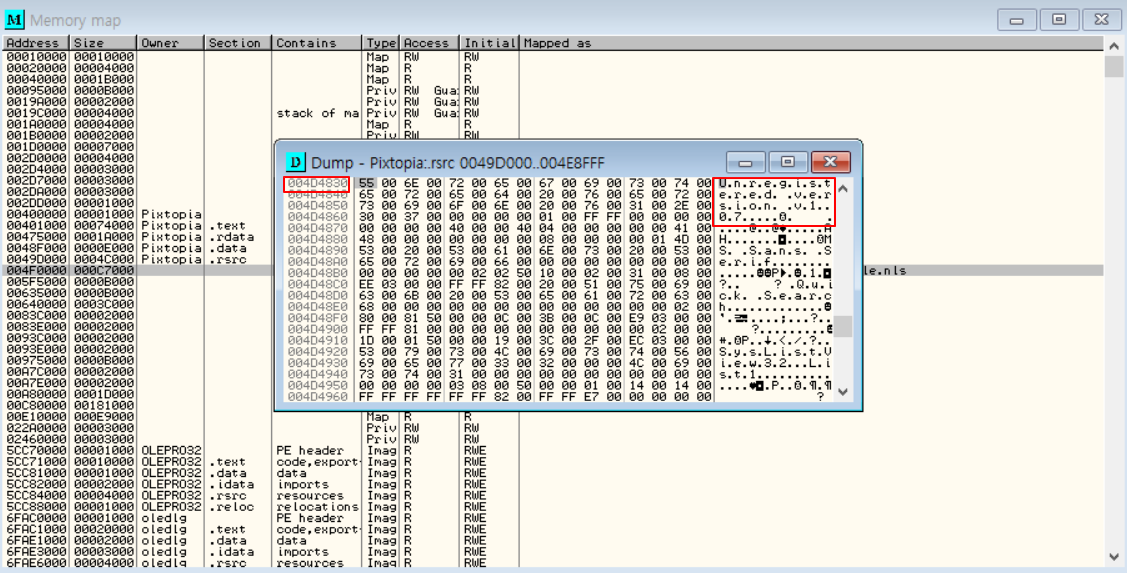 Memory map에서 Ctrl + B를 누르면 string을 검색할 수 있다. 아까 그 "UNREGITERED VERSION"(등록되지 않은 버전)