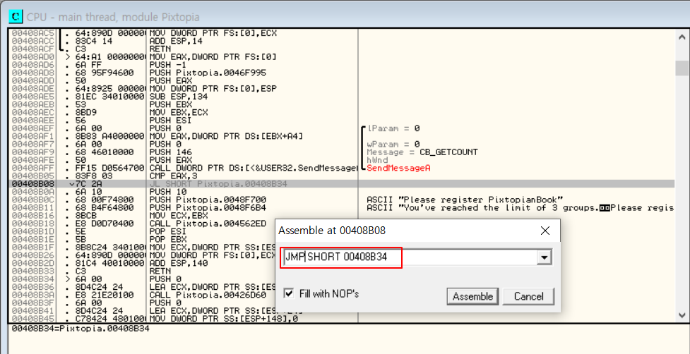 그러므로.. 이렇게 JL을 JMP로 변경하여 강제로 00408B34 주소로 Jump 시켜주면 3개 이상의 그룹을 추가 시킬 수 있다.!!!