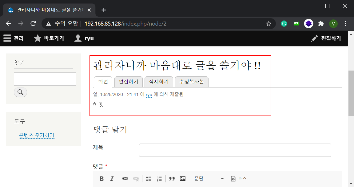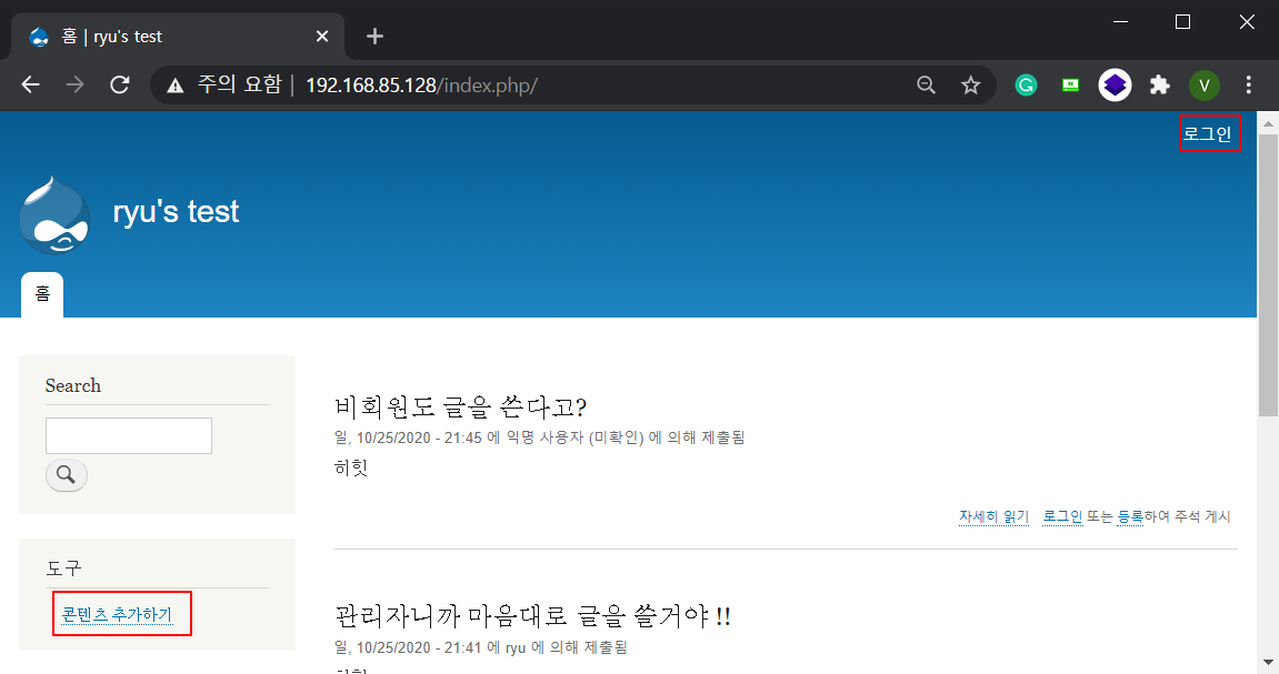 Step2. 설치가 완료된 후에 어드민 계정으로 로그인 했습니다. 콘텐츠 추가하기 버튼이 보이는데요, 아무 글이나 일단 틀어보겠습니다. [왜들 그리 가운데 있어]