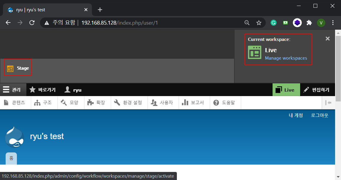Step10. Workspaces 모듈을 활성화 하면 일종의 배포버전, 테스트버전으로 나누어 콘텐츠 관리가 가능합니다.