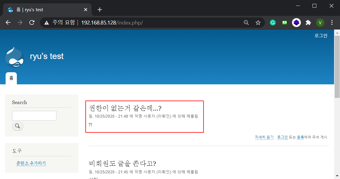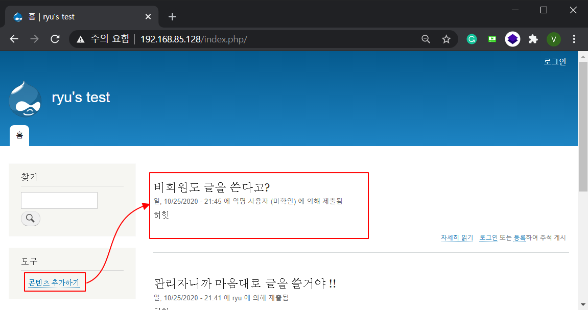 Step7. 아래와 같이 익명의 방문자에게도 콘텐츠 추가하기 버튼이 활성화 되었습니다. 정상적으로 글 작성 또한 가능한 것을 볼 수 있습니다