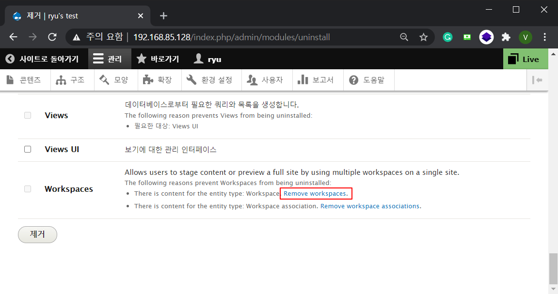 Step5. 이제 테스트는 다 했으니 만악의 근원인 워크스페이스 모듈을 비활성화 하도록 하겠습니다. 사라져버렷