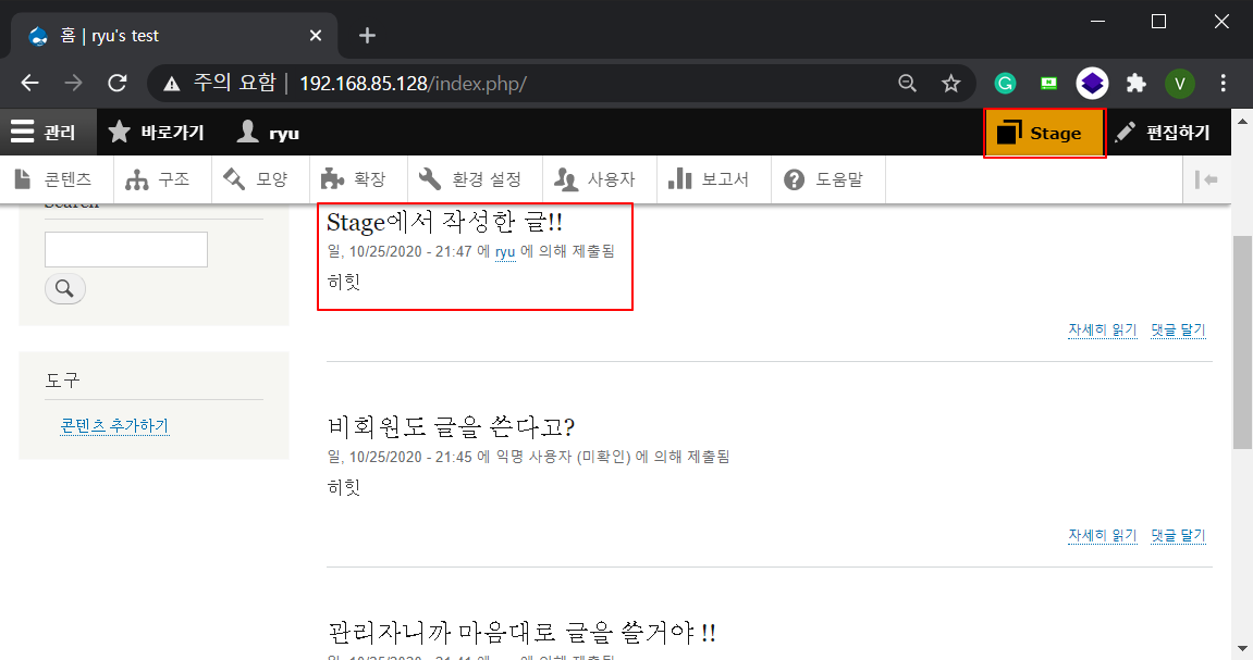 Step11. Stage 워크스페이스 변경하여 테스트 글을 작성해봅니다.